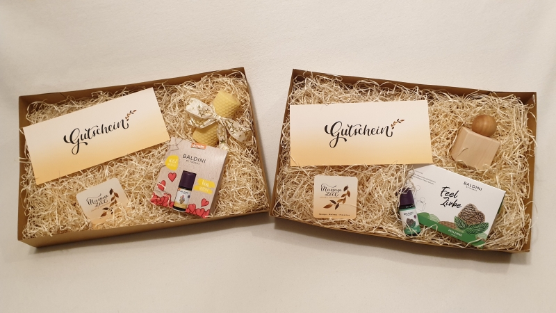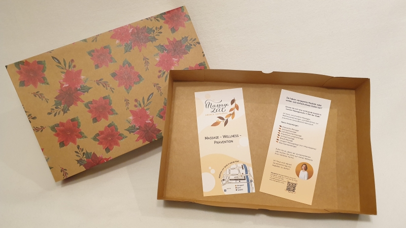 Verschenken Sie zu Weihnachten eine Weihnachts-Geschenkbox aus meinem Massagestudio – eine wohltuende Auszeit vom Alltag, liebevoll verpackt und direkt bereit zum Verschenken. Sie enthält einen Massagegutschein, ein kleines Duftset mit ätherischem Öl sowie einen Flyer mit meinen Angeboten, festlich zusammengestellt in einem weihnachtlichen Geschenkkarton mit Holzwolle. Weihnachts-Geschenkboxen ansehen